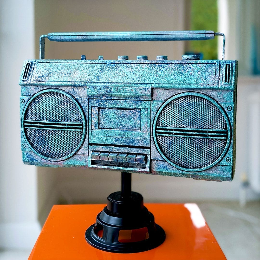 The surface of each object is heavily textured with multiple layers of paint, silica and diamond dust. The display stands are constructed individually from discarded / salvaged audio equipment.