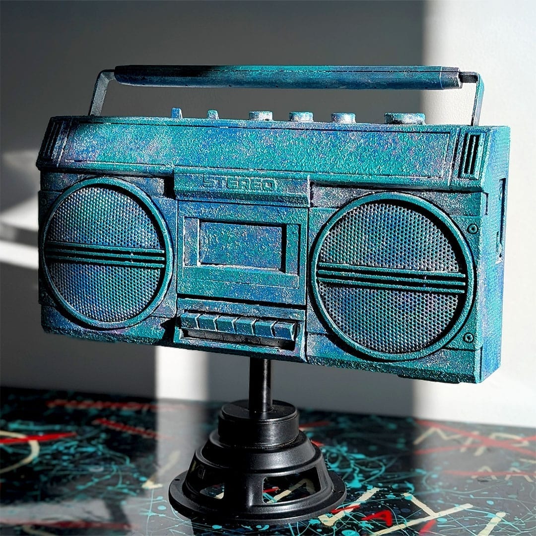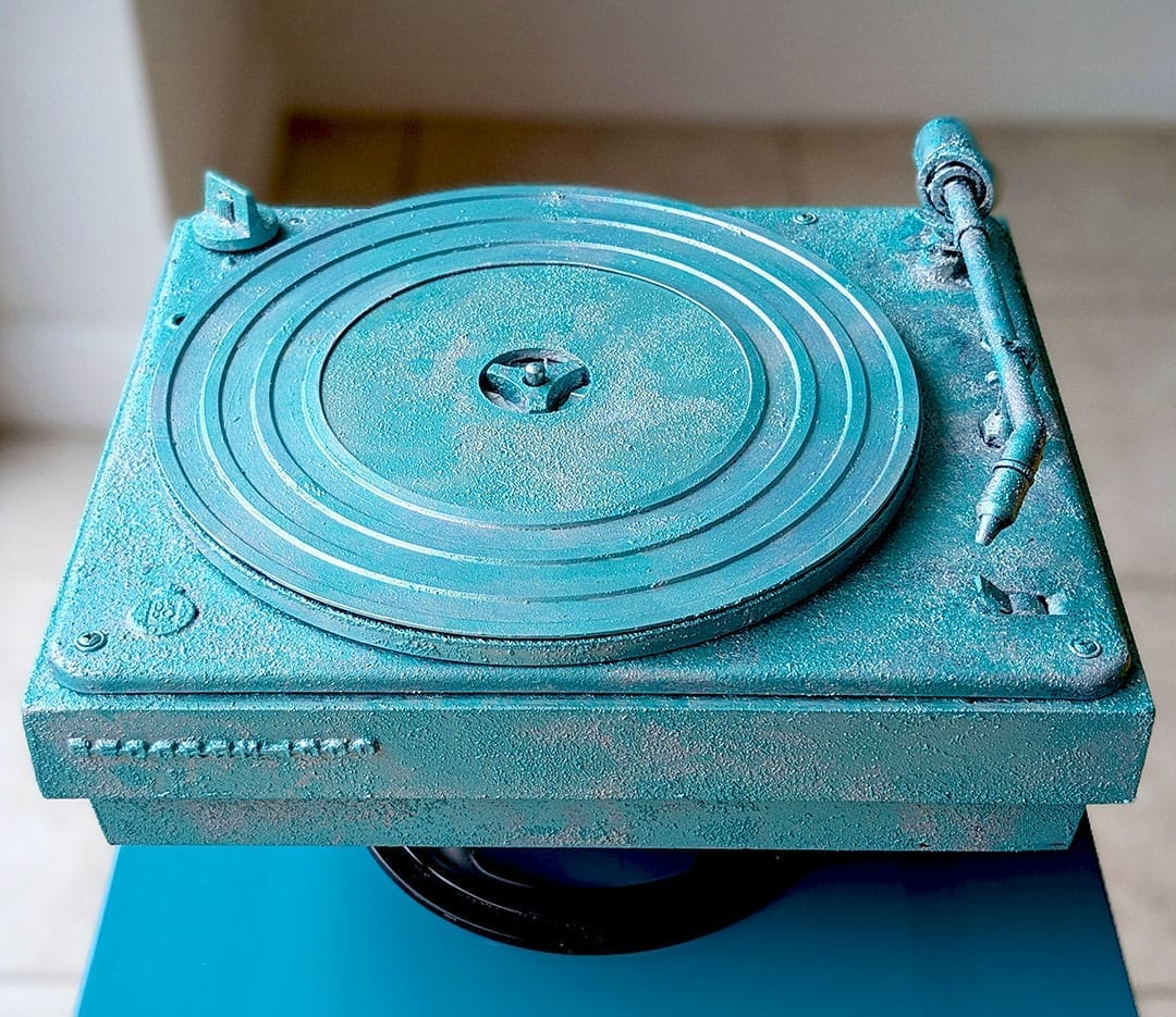 The surface of each object is heavily textured with multiple layers of paint, silica and diamond dust. The display stands are constructed individually from discarded / salvaged audio equipment.